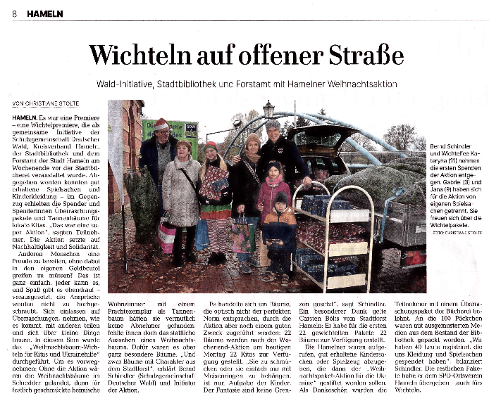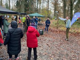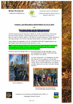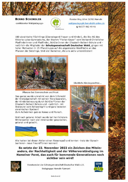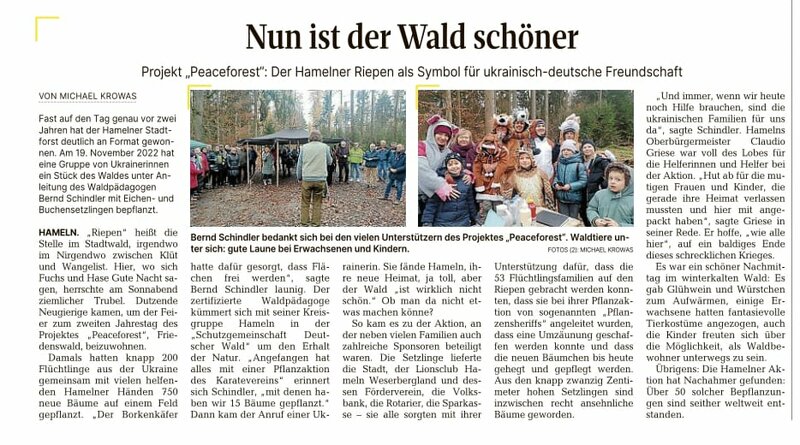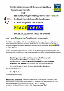 Die SDW Kreisgruppe Hameln, das Büro für Migrationsfragen sowie das Forstamt der Stadt Hameln luden zur 2. Geburtstagsfeier des Projekts "Peaceforst" ein am 24. November 2024. Der Friedenswald befindet sich im Hamelner Stadtwald und ist einer ukrainisch-deutschen Freundschaftsidee entsprungen. Mit Hilfe zahlreicher Sponsoren und vielen fleißigen Helfern konnten um den zertifizierten Waldpädagogen Bernd Schindler bisher 750 Bäume gepflanzt werden. Passend zum Anlass gab es im winterkalten Wald Glühwein und Würstchen.
