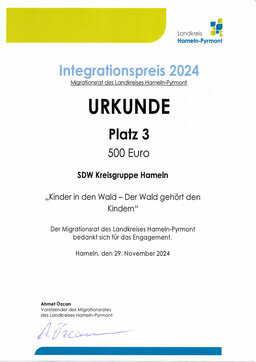 3. Platz für den SDW-Kreisverband Hameln-Pyrmont beim Integrationspreis des Migrationsrates vom Landkreis Hameln-Pyrmont