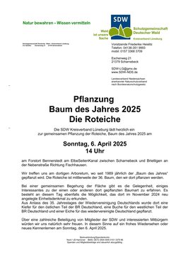 Am 6. April 2025 lud der SDW-Kreisverband Lüneburg um 14 Uhr zur Pflanzung ein, denn Frühjahr ist Pflanzzeit. Die Roteiche, der Baum des Jahres 2025, sollte am Forstort Bennerstedt am Elbe-Seitenkanal zwischen Scharnebeck und Brietlingen an der Nebenstraße Richtung Fischhausen gepflanzt werden. Neben der Pflanzung bot sich die Möglichkeit, das dort neu gestaltete Arboretum und das im vergangenen Jahr eingeweihte Einheitsdenkmal zu besichtigen.